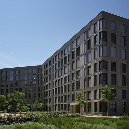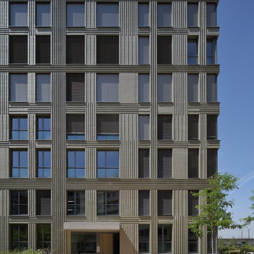 Fassadenfläche: 4000 qm Riemchen: Keramikplatten Sonderformat, 4 unterschiedliche AusführungenSonderteile: Fensterbänke, Storenkästen